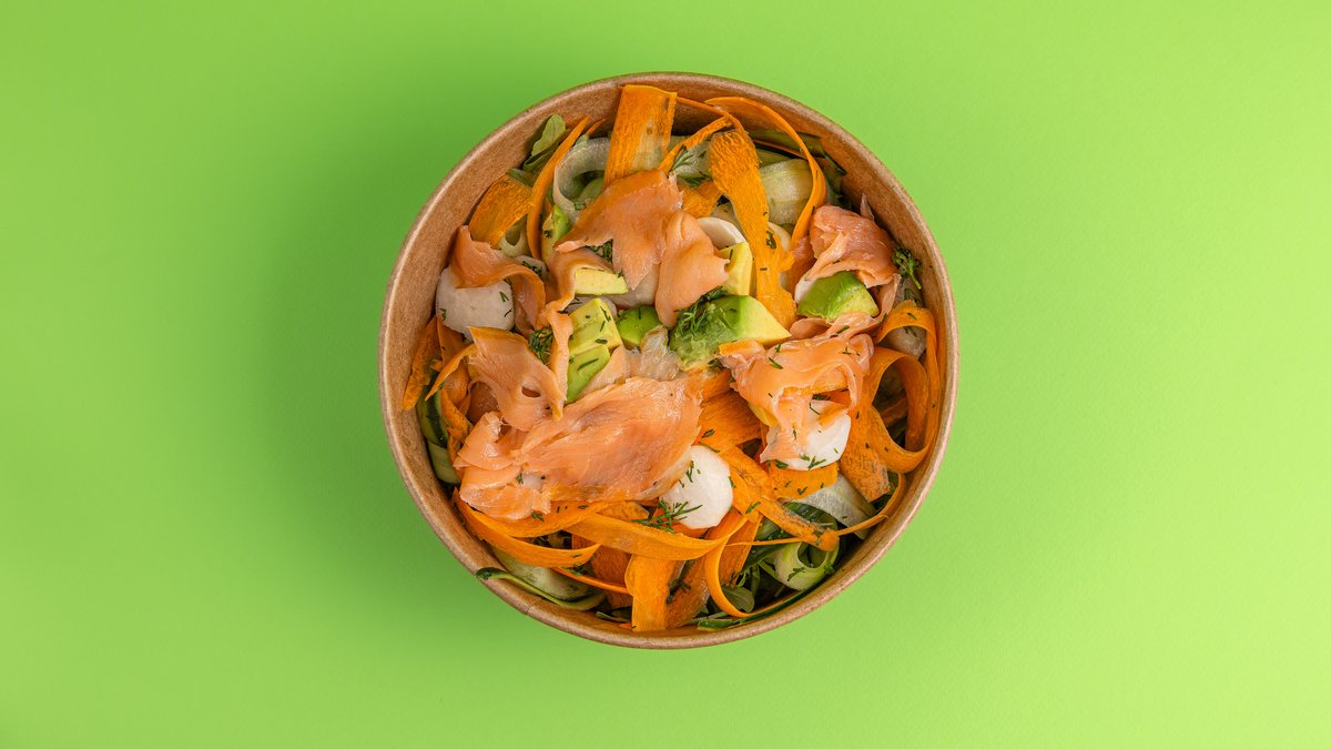 Σαλάτα με ρόκα, αγγούρι, καρότο σε φλούδες, avocado, ραπανάκια, άνηθο, σολομό καπνιστό και dressing με ελαιόλαδο, ξύδι, λεμόνι, μουστάρδα, γιαούρτι, πιπέρι και αλάτι