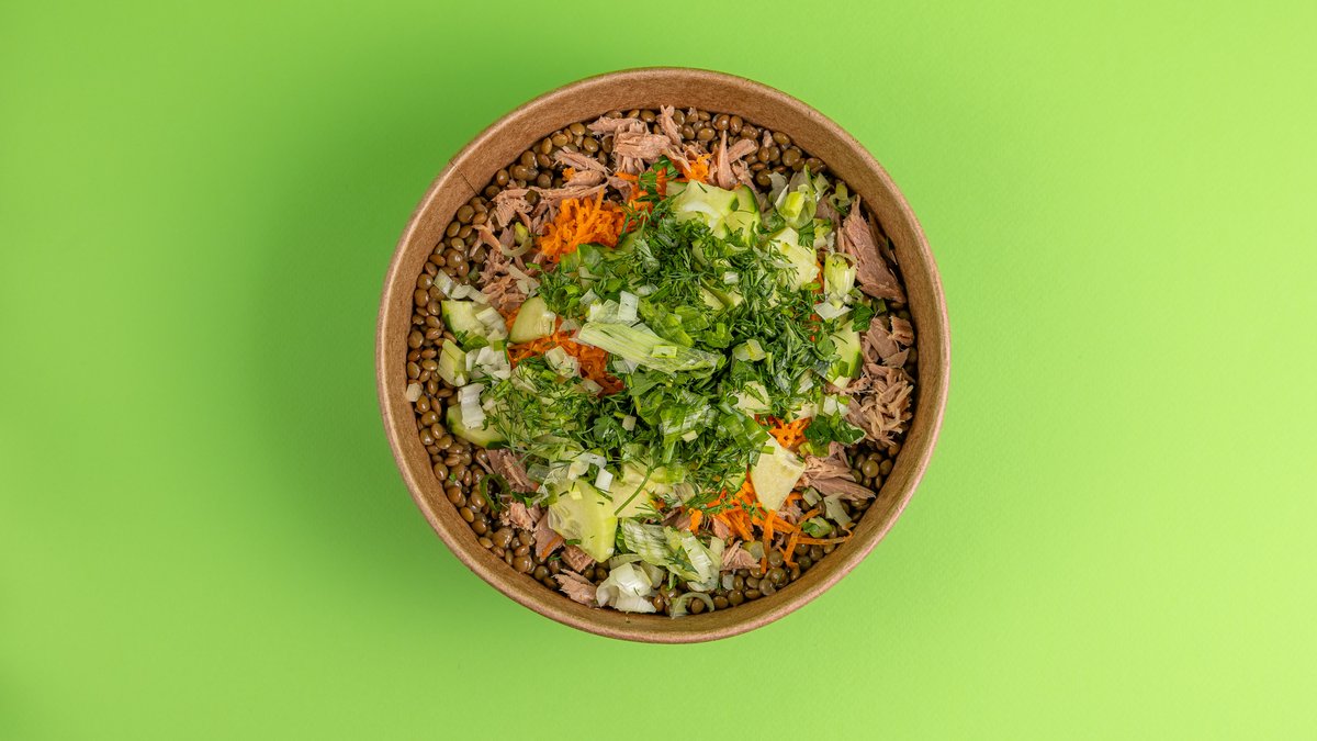 Σαλάτα με φακές, τόνο, καρότο, αγγούρι, άνηθο, μαϊντανό, κρεμμύδι φρέσκο και dressing με ελαιόλαδο, λεμόνι, αλάτι και πιπέρι