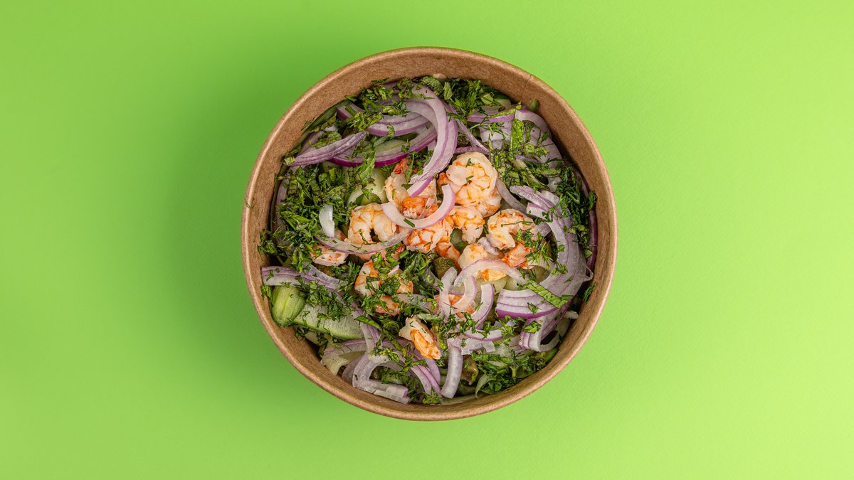 Σαλάτα με αγγούρι σε φλούδες, κάππαρη, αγγουράκι τουρσί, κρεμμύδι ξερό, δυόσμο, άνηθο, γαρίδες και dressing με ελαιόλαδο, χυμό λεμόνι, ζάχαρη μαύρη, γιαούρτι, αλάτι και πιπέρι