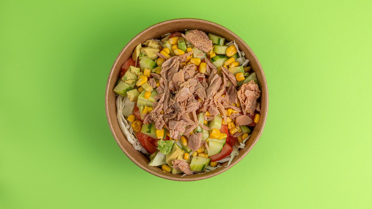 Σαλάτα με λάχανο, αγγούρι, ντομάτα, καλαμπόκι, avocado, τόνο και dressing με ελαιόλαδο, λεμόνι, μουστάρδα, αλάτι και πιπέρι
