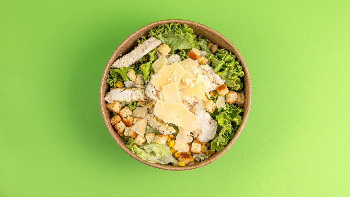 Σαλάτα με μαρούλι, κοτόπουλο, καλαμπόκι, κρουτόν, φλούδες παρμεζάνας και dressing με ελαιόλαδο, μουστάρδα, σκόρδο, ξύδι, κρόκο αυγού, αντζούγιες, αλάτι και πιπέρι