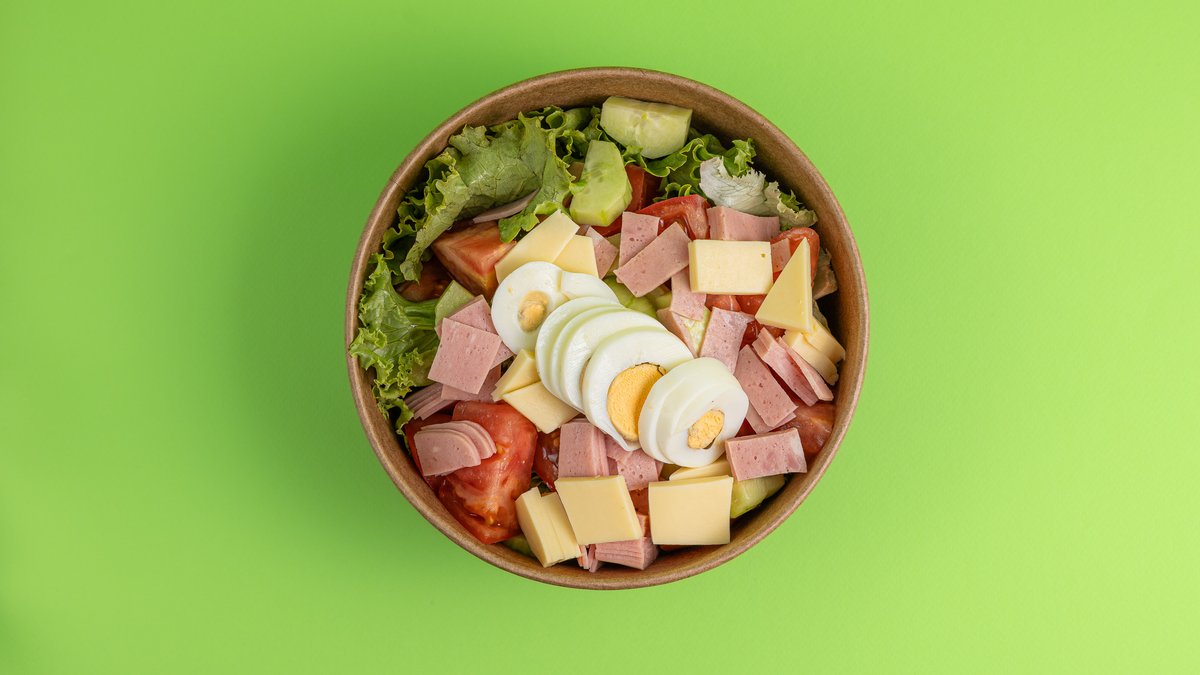 Σαλάτα με μαρούλι, ντομάτα, αγγούρι, ζαμπόν, τυρί, αυγά βρασμένα και dressing με ελαιόλαδο, μαγιονέζα light, ketchup, ξύδι, αλάτι και πιπέρι