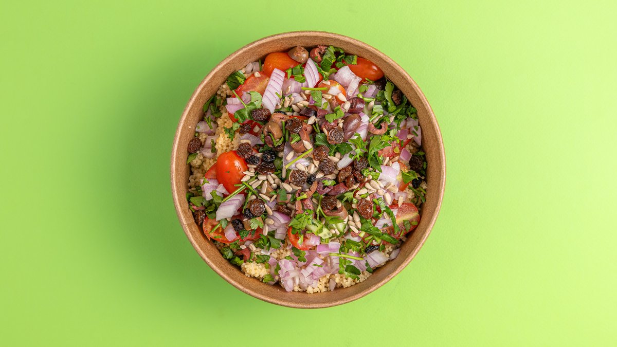 Με κους κους, ντοματίνια, αγγούρι, κόκκινο κρεμμύδι, ελιές σε ροδέλα, μαιντανός, σταφίδες και ηλιόσπορος. Με dressing ξύσμα και χυμό λεμονιού,ελαιόλαδο, ρίγανη, αλάτι και πιπέρι