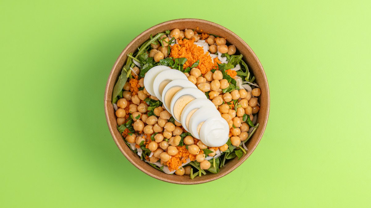 Με σπανάκι, λευκό λάχανο, ρόκα, μαιντανό, ρεβύθια και αυγό σε ροδέλες. Με dressing λαδολέμονο, αλάτι και πιπέρι