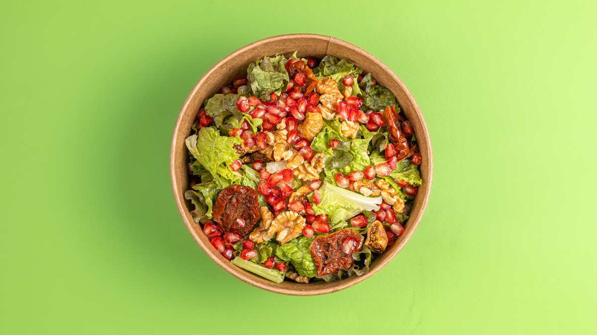 Με λόλα ανάμεικτη, αποξηραμένο σύκο,τυρί κατσικίσιο, προσούτο,λιαστή ντομάτα, καρύδια και ρόδι & dressing ροδιού
