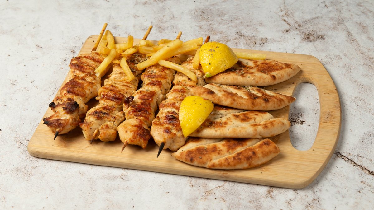 4 Τεμάχια των 100g. Συνοδεύεται από 2 πίτες, ντομάτα, πατάτες τηγανητές και σως επιλογής