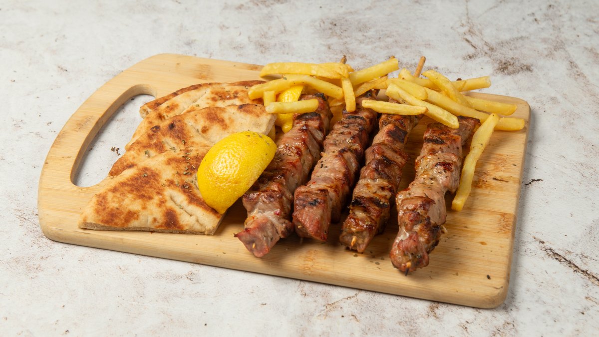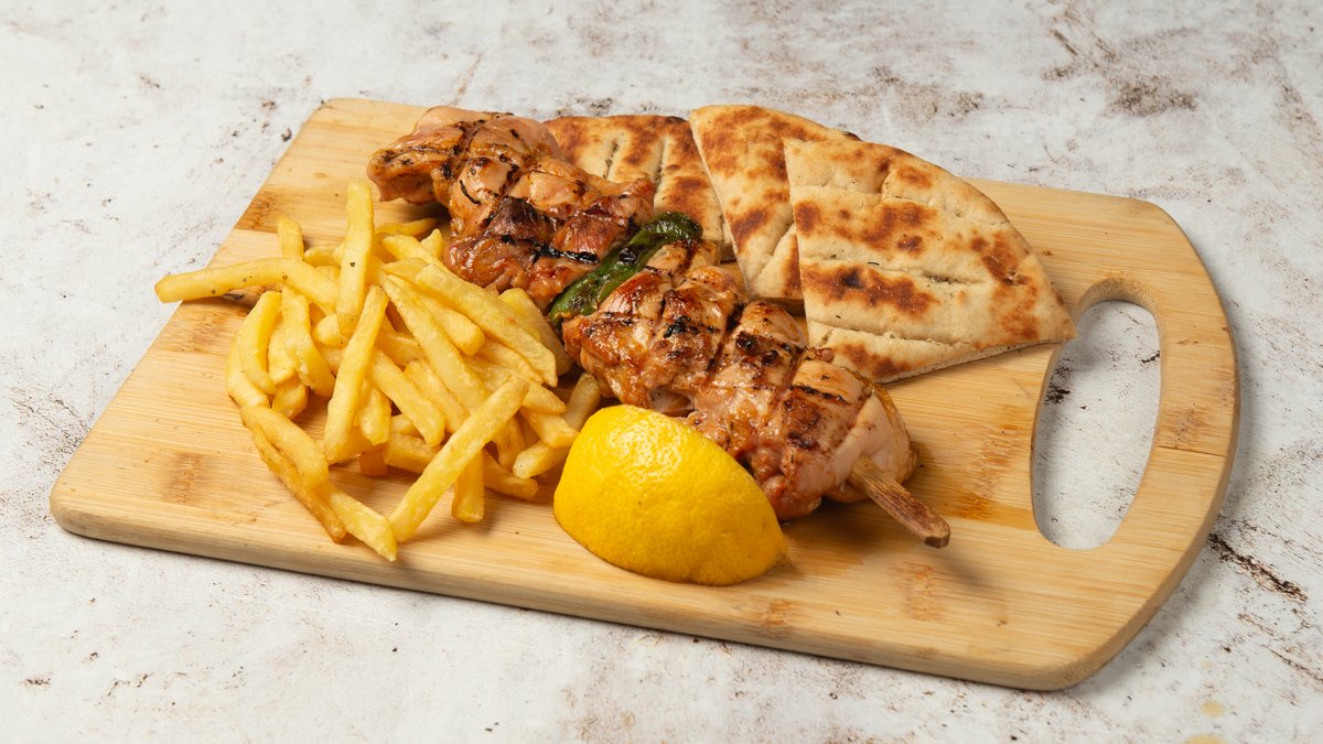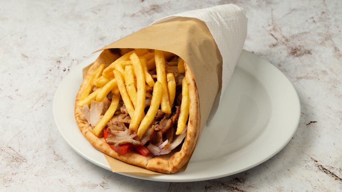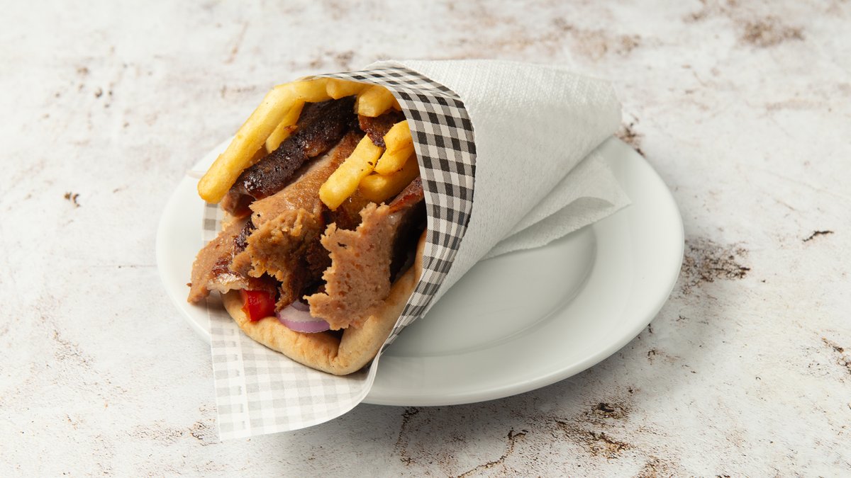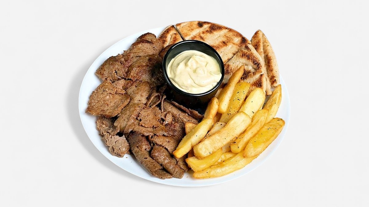 Συνοδεύεται από 2 πίτες, ντομάτα, πατάτες τηγανητές, κρεμμύδι και σως επιλογής