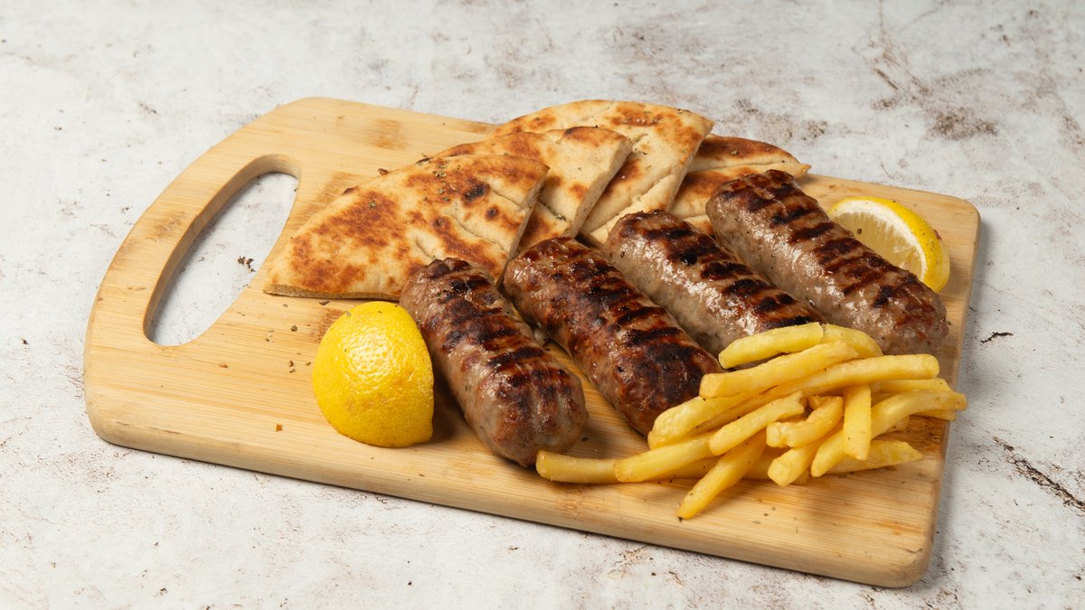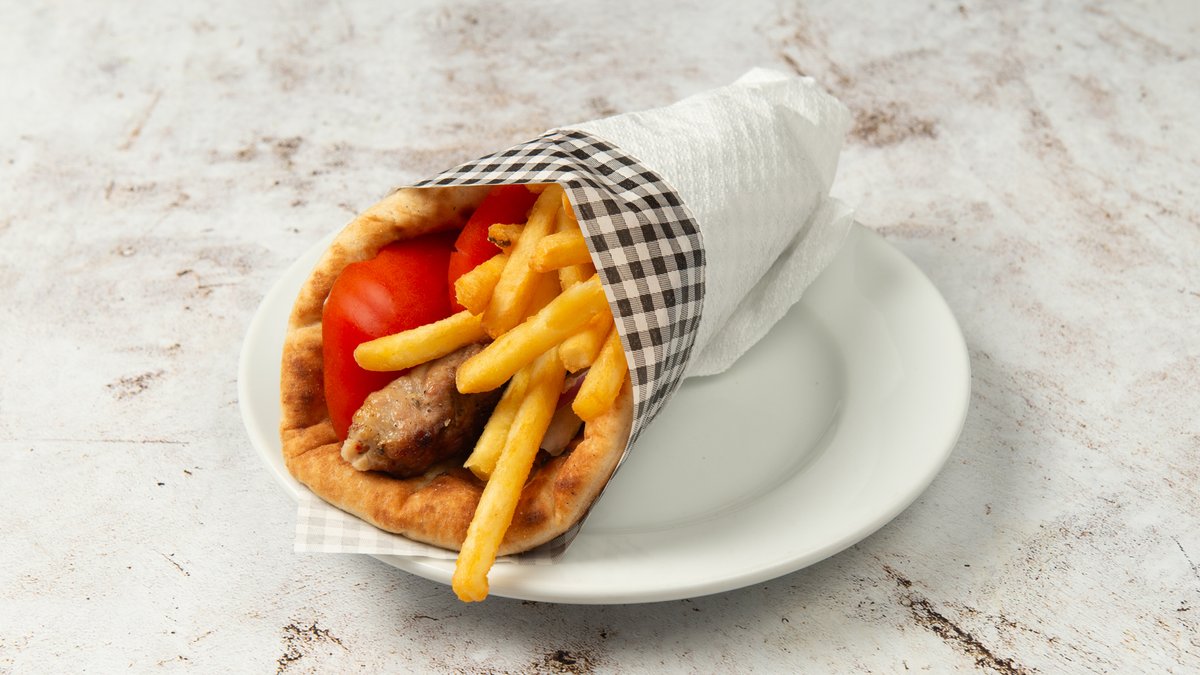 Συνοδεύεται από πίτα, ντομάτα, πατάτες τηγανητές, κρεμμύδι και σως επιλογής