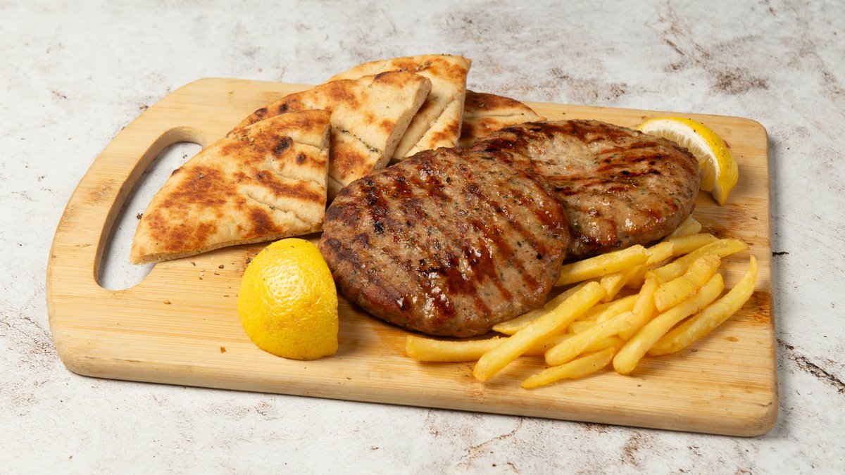 4 Τεμάχια των 100g. Συνοδεύεται από 2 πίτες, ντομάτα, πατάτες τηγανητές, κρεμμύδι και σως επιλογής