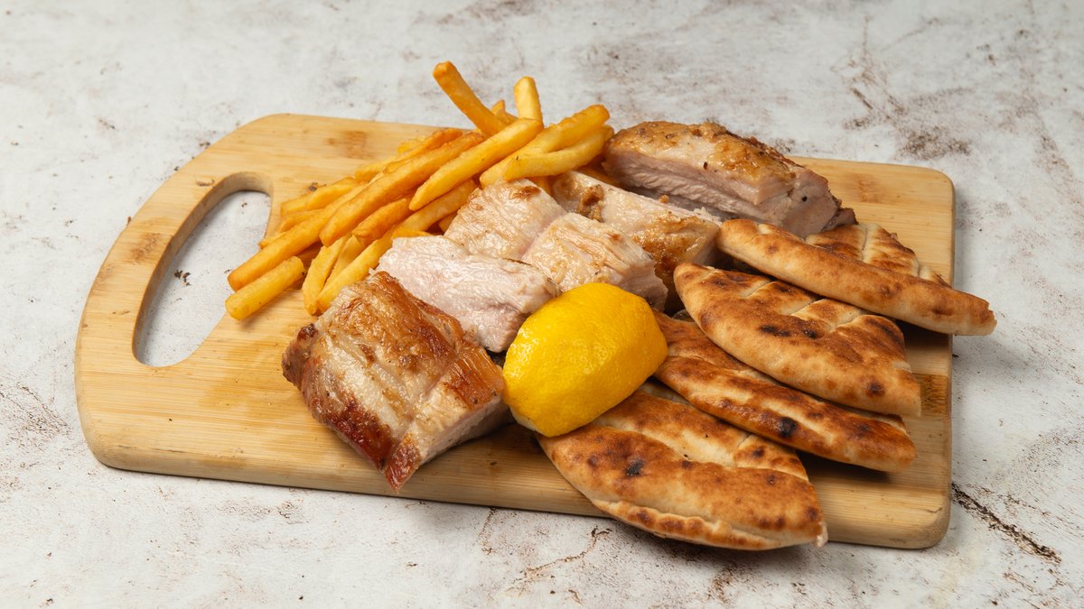 Συνοδεύεται από ντομάτα, πατάτες τηγανητές και 1 πίτα παραδοσιακή
