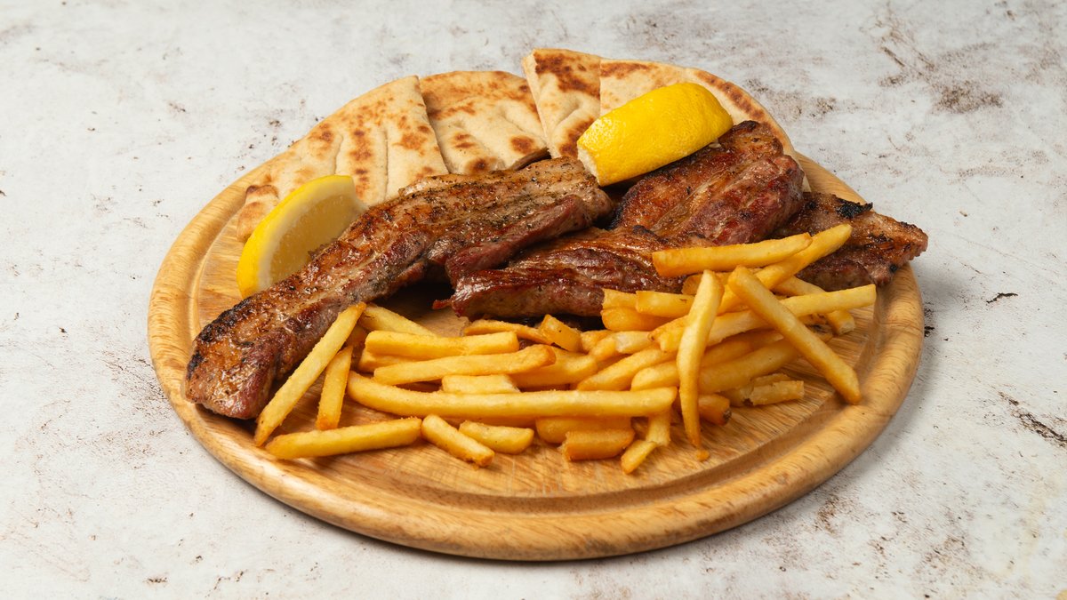 Συνοδεύεται από ντομάτα, πατάτες τηγανητές, κρεμμύδι , πίτες κομμένες και τζατζίκι