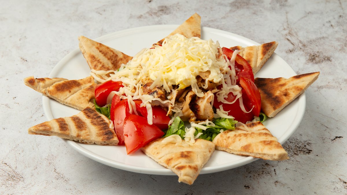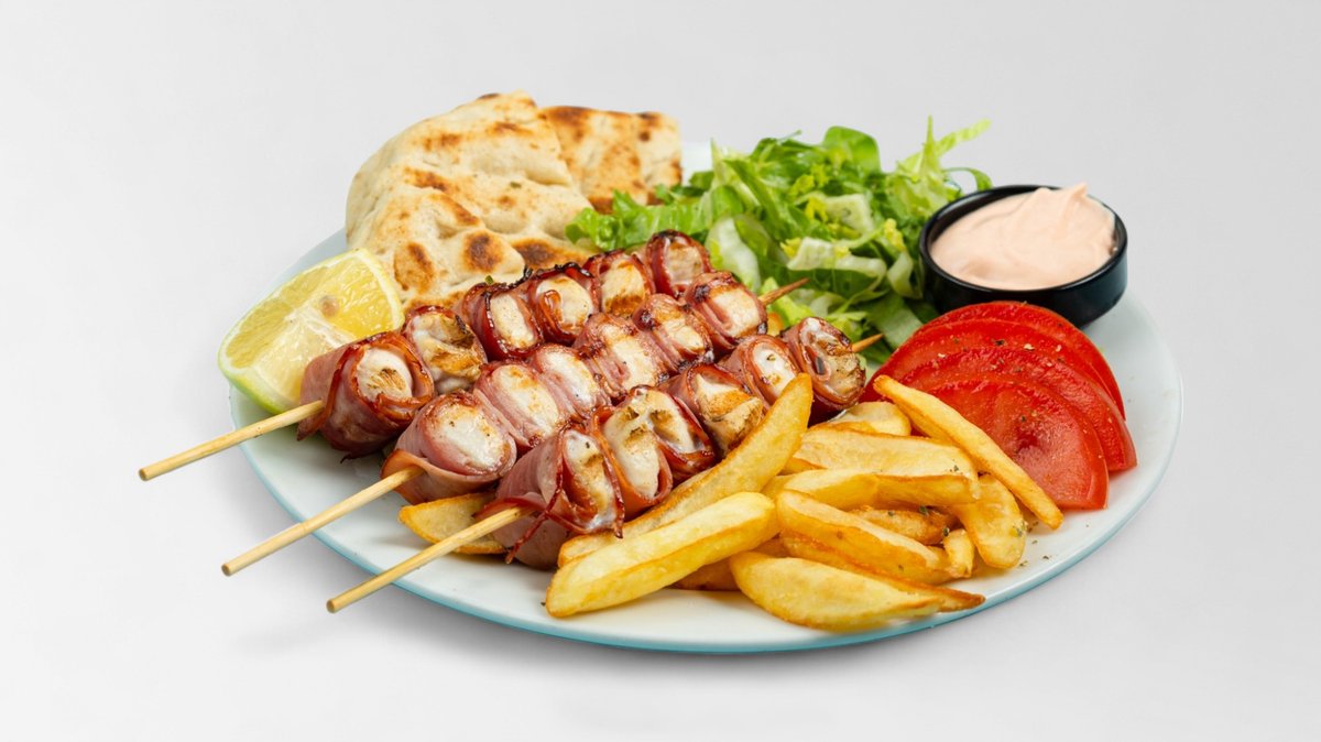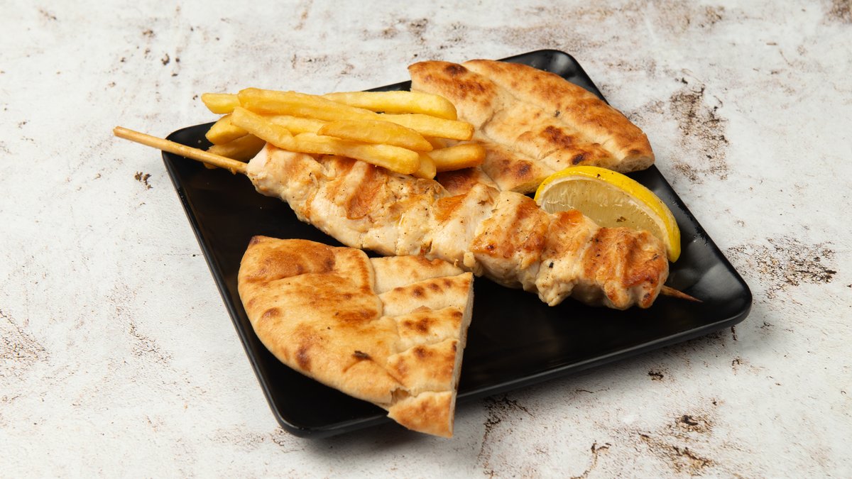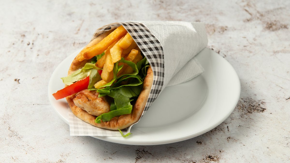 Συνοδεύεται από 2 πίτες, ντομάτα, πατάτες τηγανητές και σως επιλογής