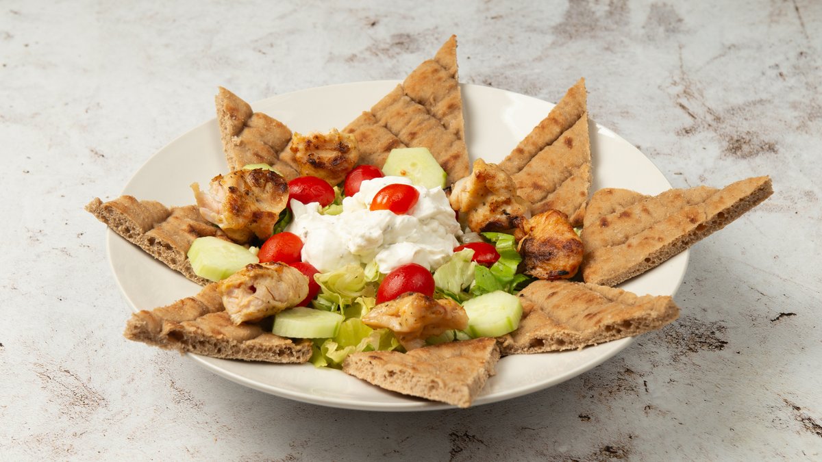 Σαλάτα με μαρούλι, αγγούρι, ντομάτα, καλαμάκι φιλέτο κοτόπουλο, σως γιαουρτιού και 1 πίτα ολικής άλεσης