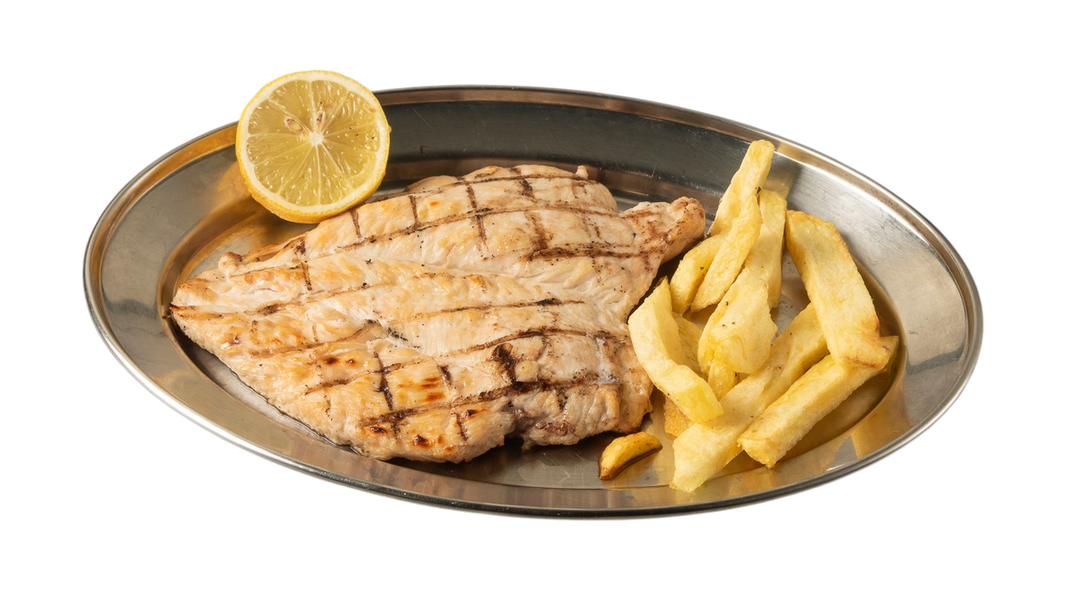 Με κόκκαλο. Συνοδεύεται από πατάτες τηγανητές και σάλτσα λεμόνι και μουστάρδα