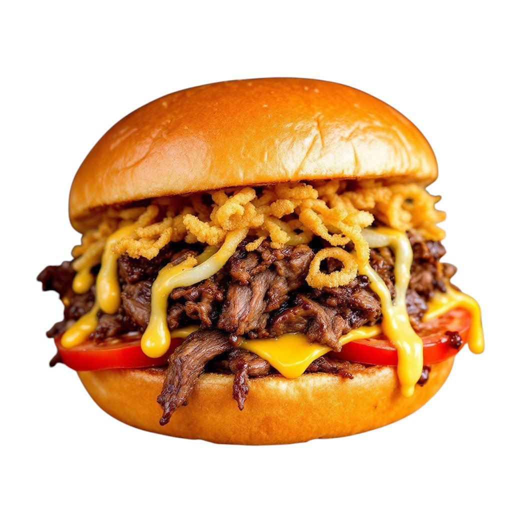 Με μπιφτέκι μοσχαρίσιο, λιωμένο κίτρινο τυρί, ντομάτα, μαρούλι, κρεμμύδι και BBQ σως. Συνοδεύεται από πατάτες τηγανητές