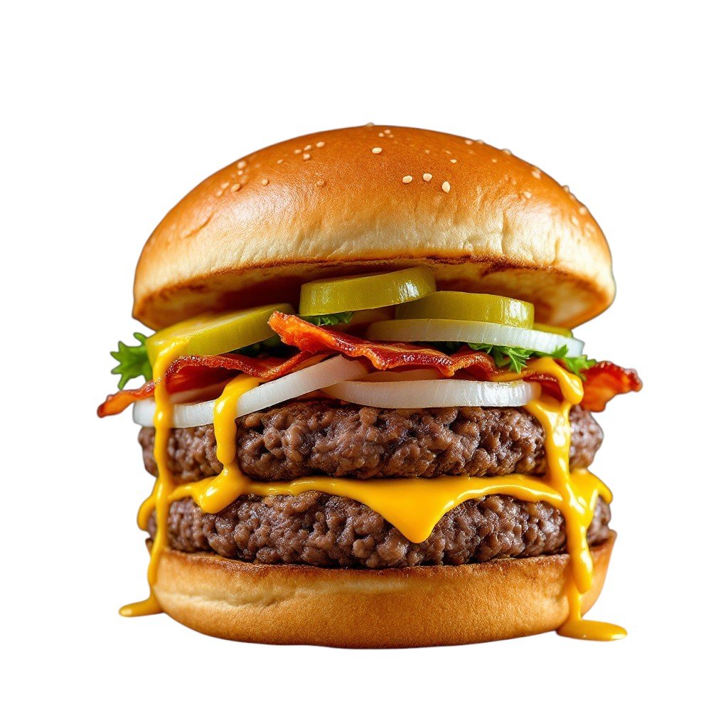 Με διπλό μοσχαρίσιο μπιφτέκι, λιωμένο κίτρινο τυρί, ντομάτα, μαρούλι, κρεμμύδι και BBQ σως. Συνοδεύεται από πατάτες τηγανητές