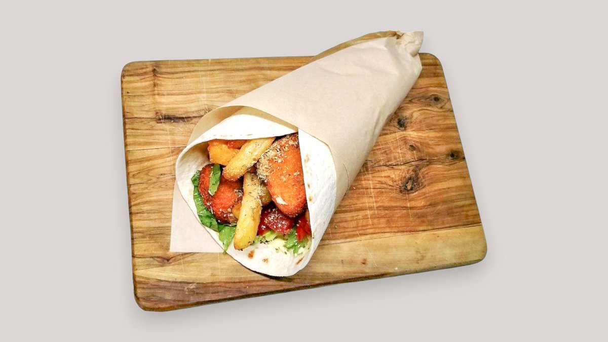 Συνοδεύεται από πατάτες τηγανητές, ντομάτα, μαρούλι και σως της επιλογής σου