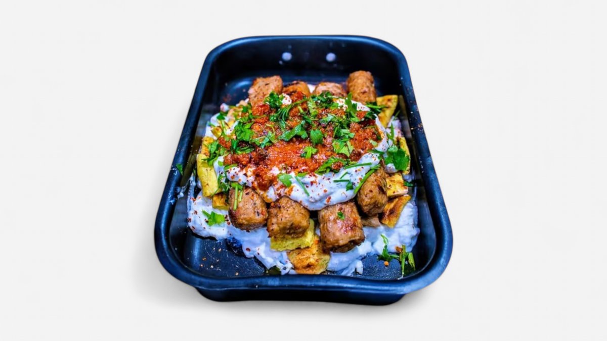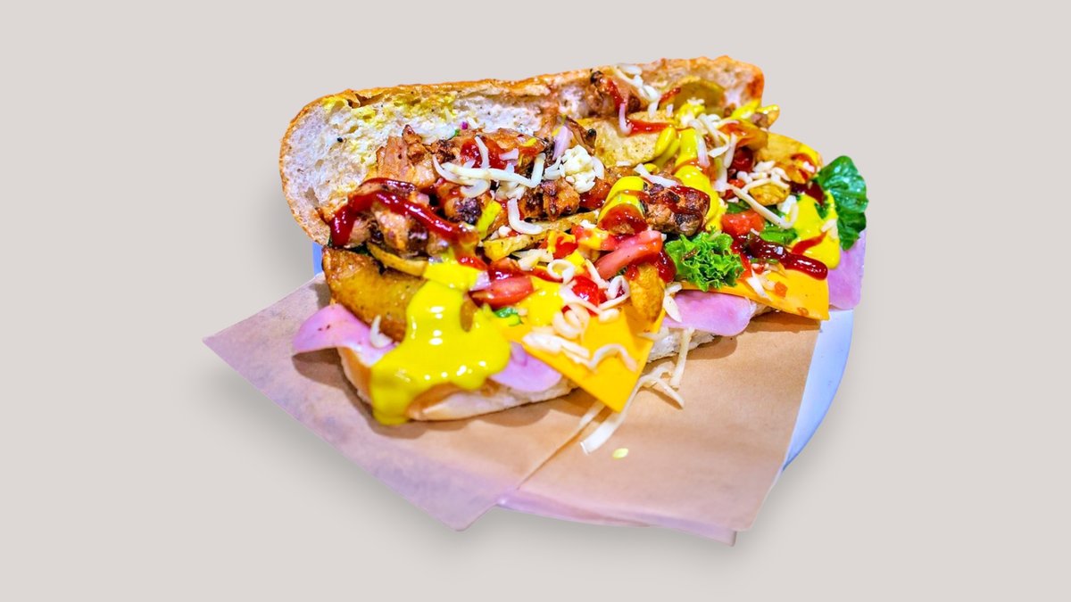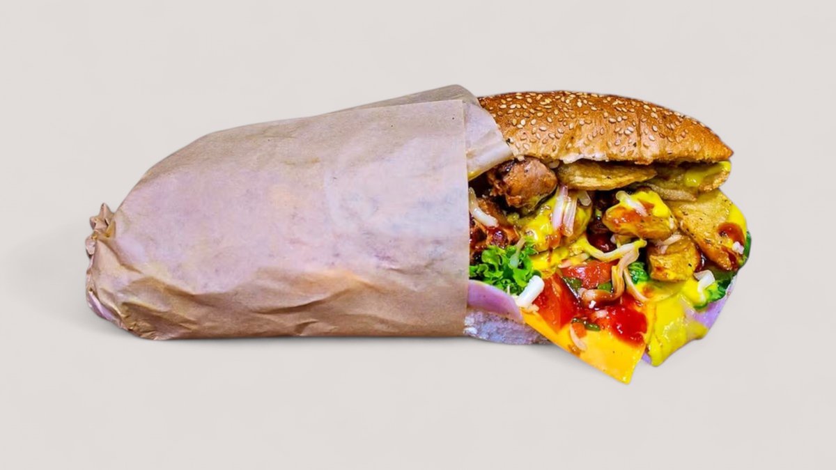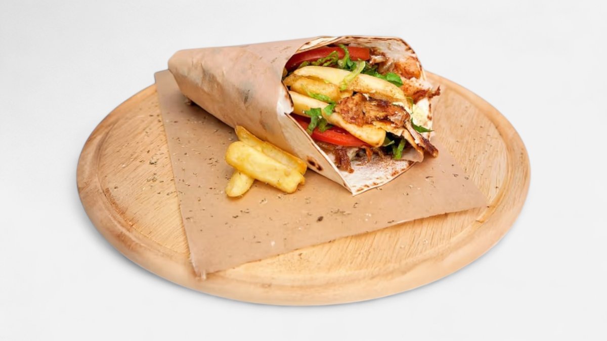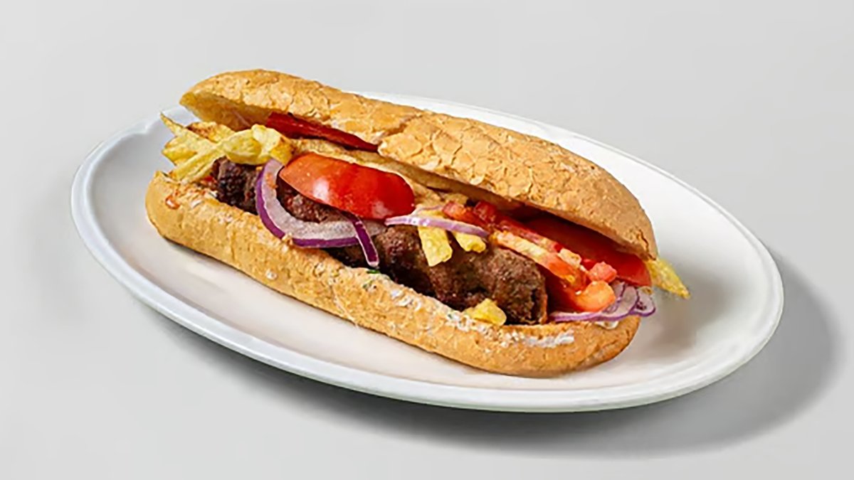 Συνοδεύεται από πατάτες τηγανητές, ντομάτα, κρεμμύδι και σως της επιλογής σου