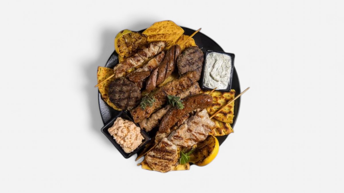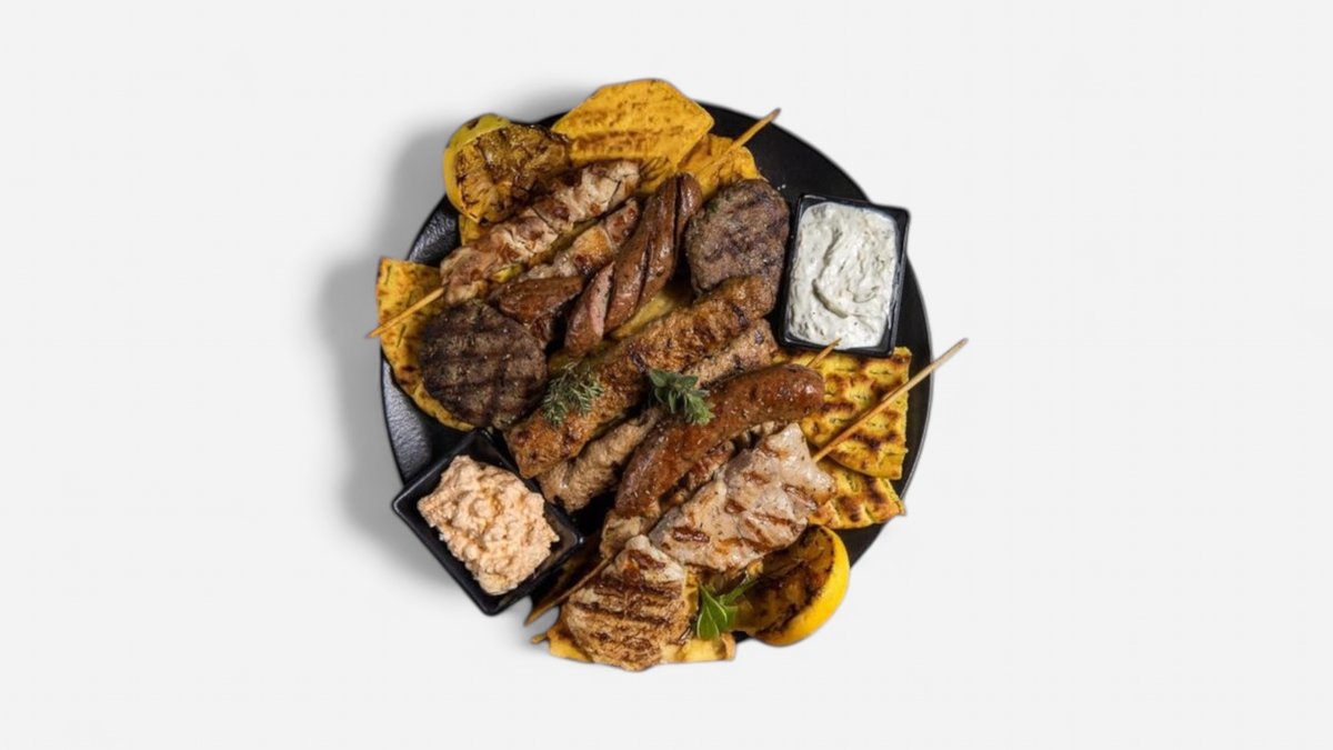 Με γύρο χοιρινό, γύρο κοτόπουλο, 2 κεμπάπ, 2 πανσέτες, 2 μπιφτέκια μοσχαρίσια, 2 καλαμάκια κοτόπουλο και 2 λουκάνικα χωριάτικα. Συνοδεύεται από πατάτες τηγανητές, 2 πίτες και σως της επιλογής σου