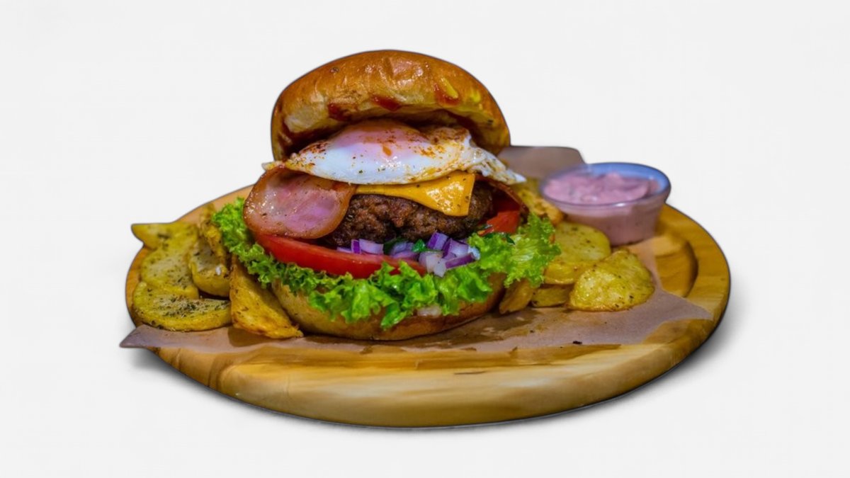 Με διπλό μπιφτέκι μοσχαρίσιο, μπέικον, ντομάτα, κρεμμύδι, μαρούλι, cheddar, ketchup, μουστάρδα και μαγιονέζα. Συνοδεύεται από πατάτες τηγανητές και σως cocktail