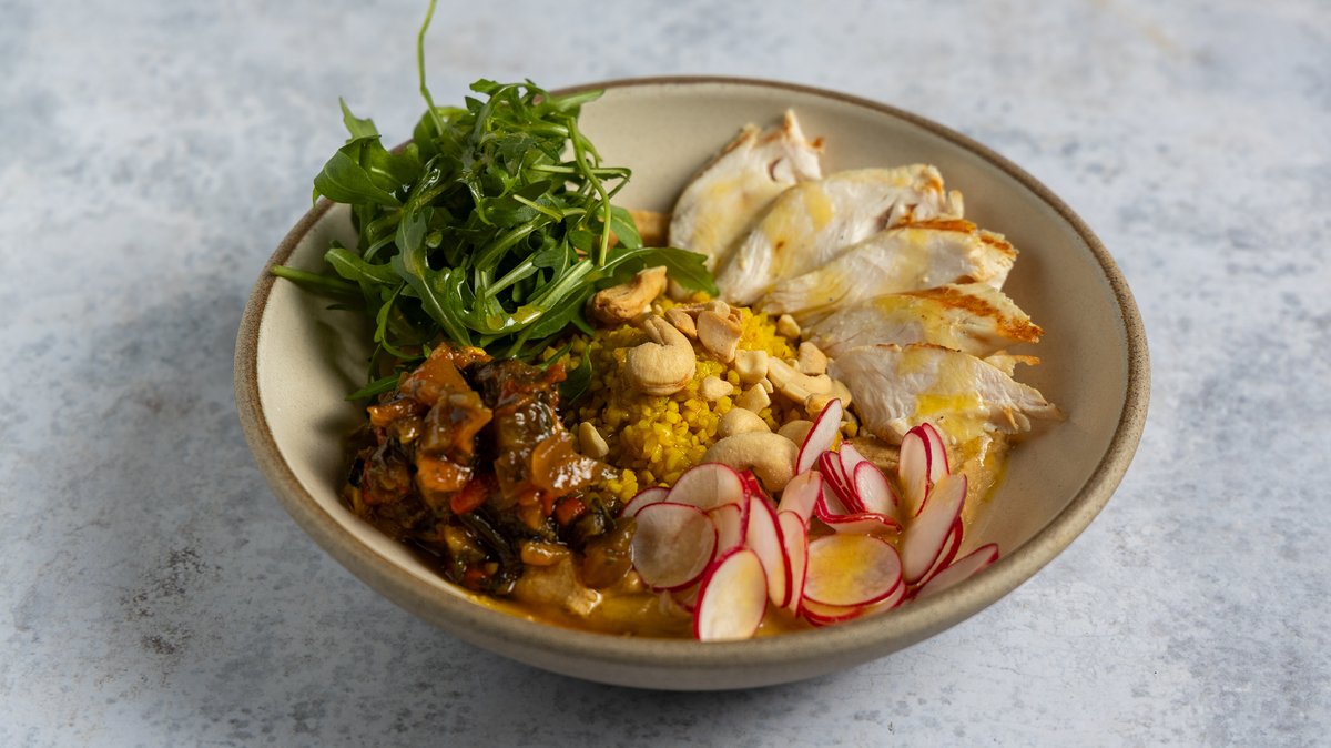 Χούμους μπολ με κοτόπουλο σχάρας ,πλιγούρι,pico de gallo ,ραπανάκι , κασιους και ρόκα .
