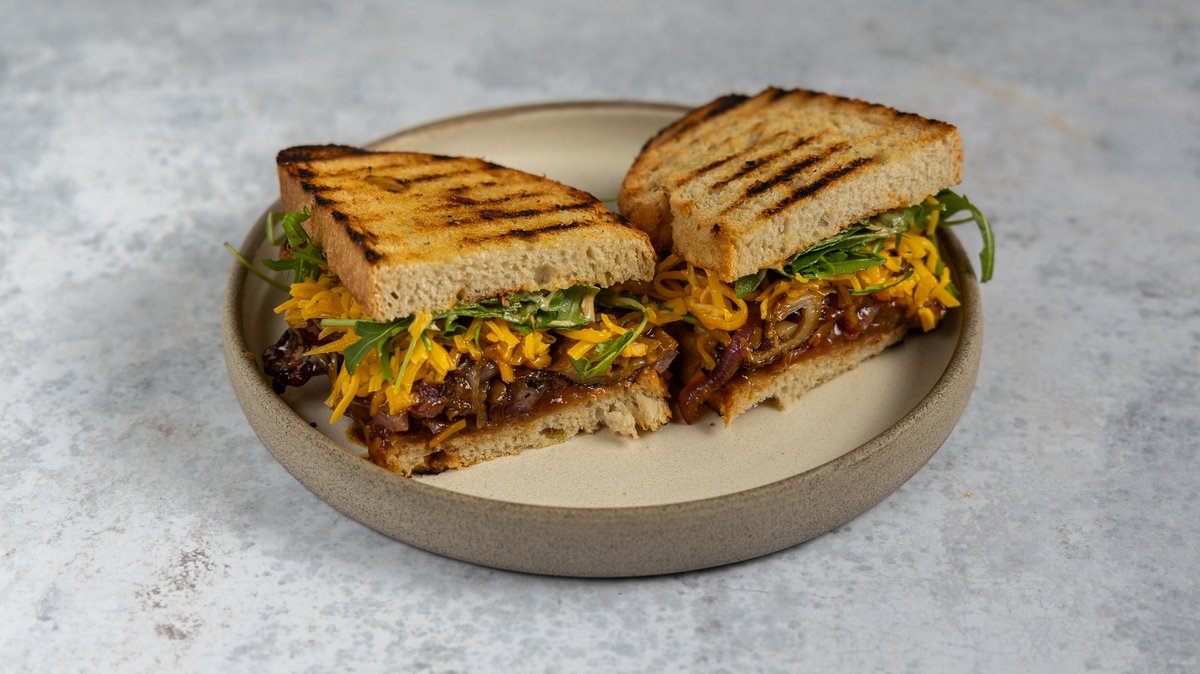 Με καραμελωμένα κρεμμύδια, miso μαγιονέζα, ρόκα και τυρί cheddar