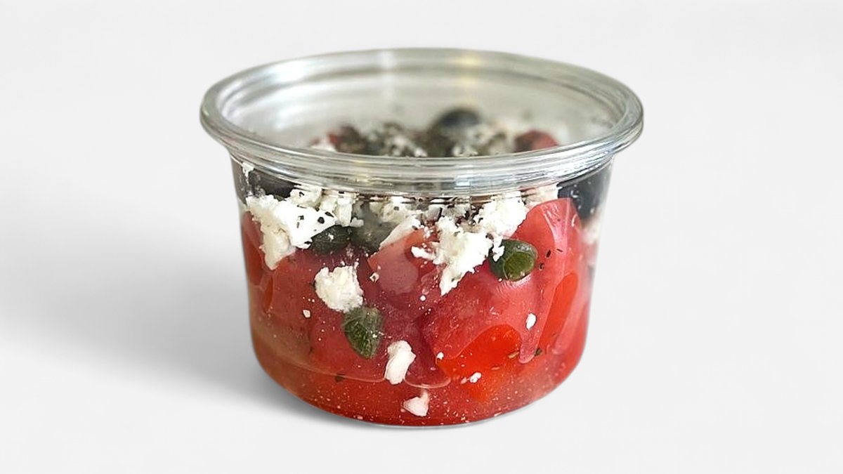 Τοματοσαλατα με φέτα ,κάππαρη ,ρίγανη,κριταμο ,σπιτικό κρουτόν και ελιές .
