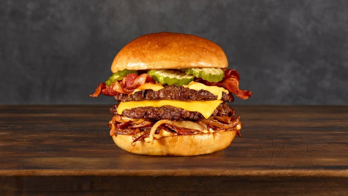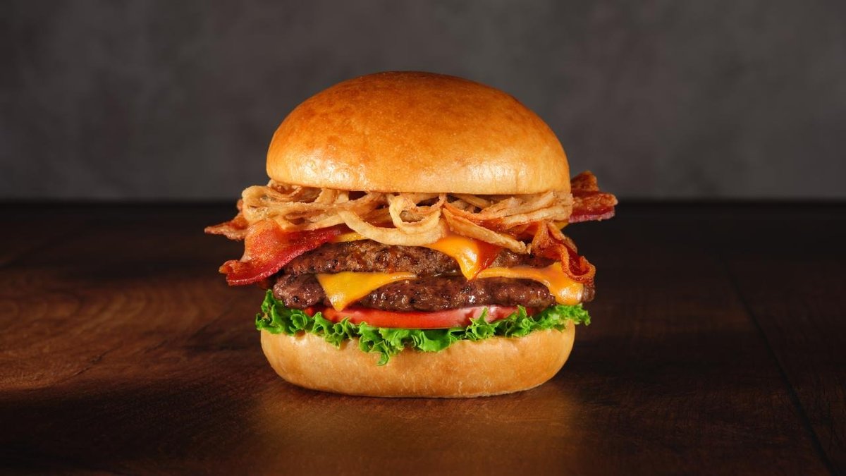 2 Smashed Burgers | Signature Spice Blend | Barbecue Sauce| Crispy Shoestring Onions | Cheddar | Bacon | Lettuce | Tomato | Toasted Artisan Bun