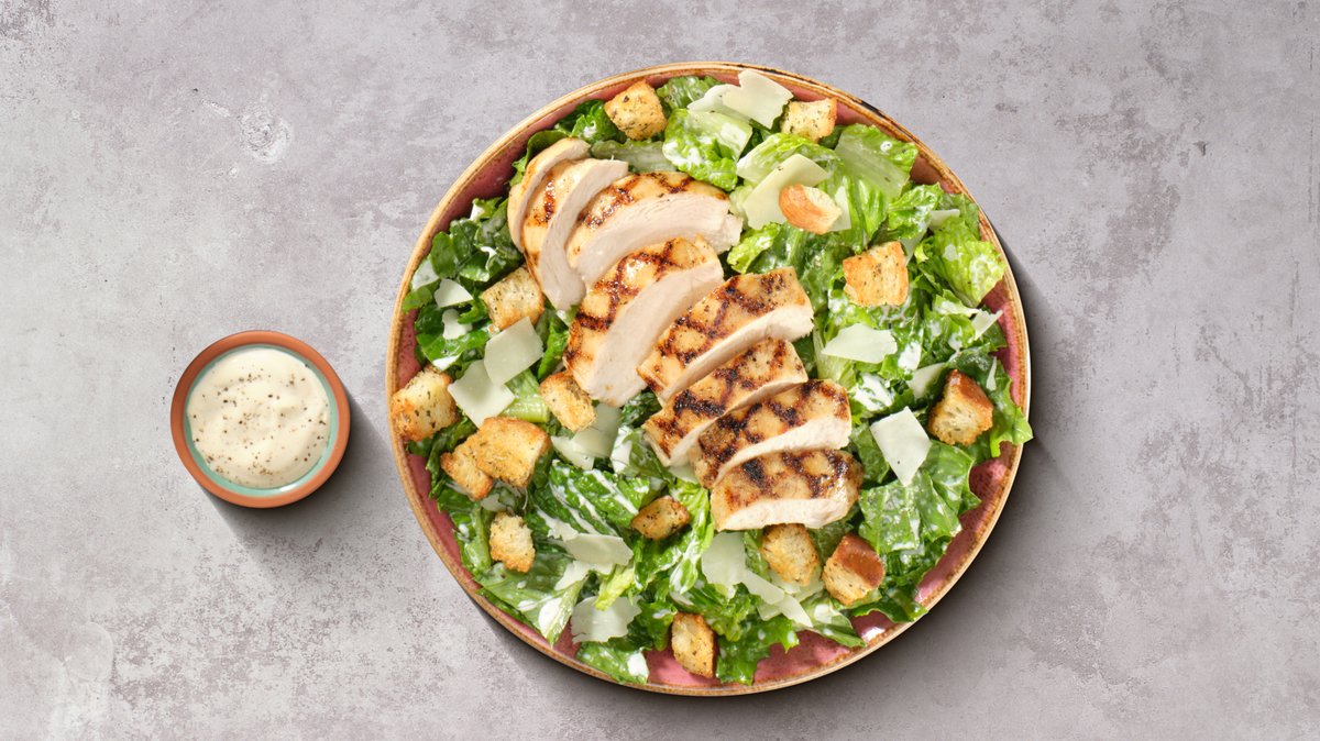 Mixed Romaine | Classic Caesar Dressing | Parmesan Crisps | Shaved Parmesan Cheese | Grilled Chicken | No Croutons