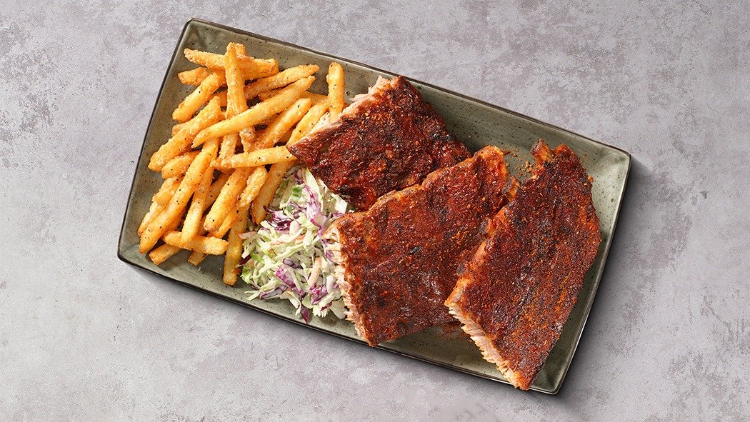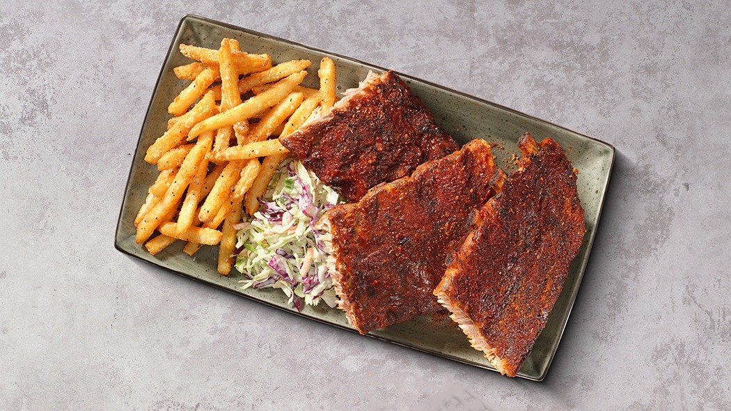 Τρυφερό καπνιστό χοιρινό Baby Back Ribs καρυκευμένα και περιχυμένα με την αυθεντική μας BBQ σως. Ψήνονται με τρόπο που αγγίξει την τελειότητα. Σερβίρεται με πατάτες τηγανητές και σαλάτα coleslaw.