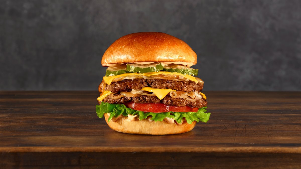 2 Smashed Burgers | Shaved White Onion | American Cheese | Lettuce | Tomato | Legendary Sauce | Pickles | Toasted Artisan Bun |