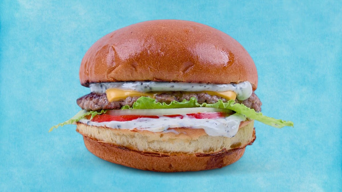 Με 100% μοσχαρίσιο μπιφτέκι, cheddar, iceberg, ντομάτα, κρεμμύδι και secret sause