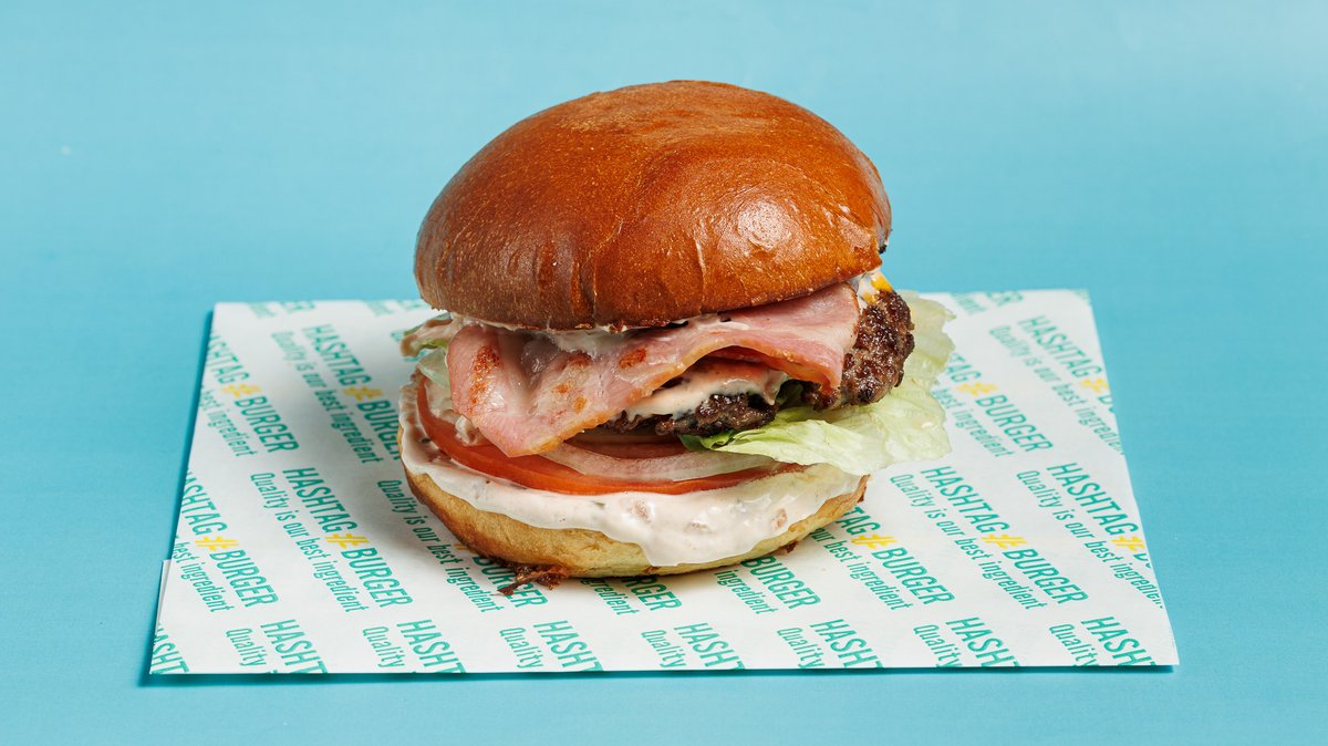 Με 100% μοσχαρίσιο μπιφτέκι, ντομάτα, iceberg, κρεμμύδι, μαγιονέζα τρούφας και μπέικον