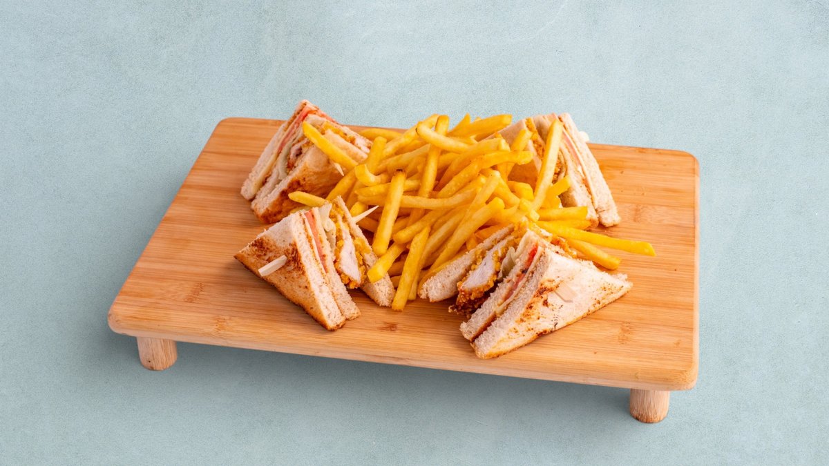 Με φρυγανισμένο ψωμί τοστ, κοτόπουλο πανέ, γκούντα, ντομάτα, iceberg και honey mustard sause