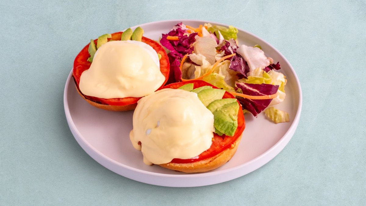 2 αυγά ποσέ με ντομάτα, αβοκάντο, μπέικον ή σολομό καπνιστό και sause hollandaise