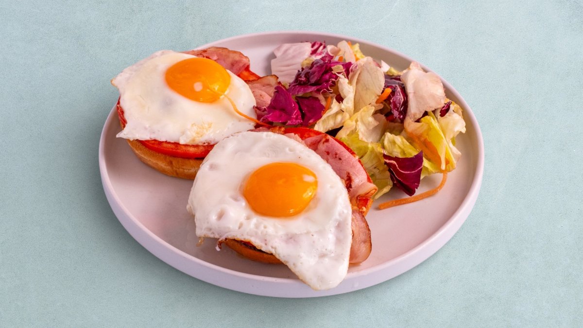 2 αυγά μάτια, ντομάτα, μπέικον πάνω σε ψωμί brioche. Συνοδεύεται από πατάτες τηγανητές ή σαλάτα