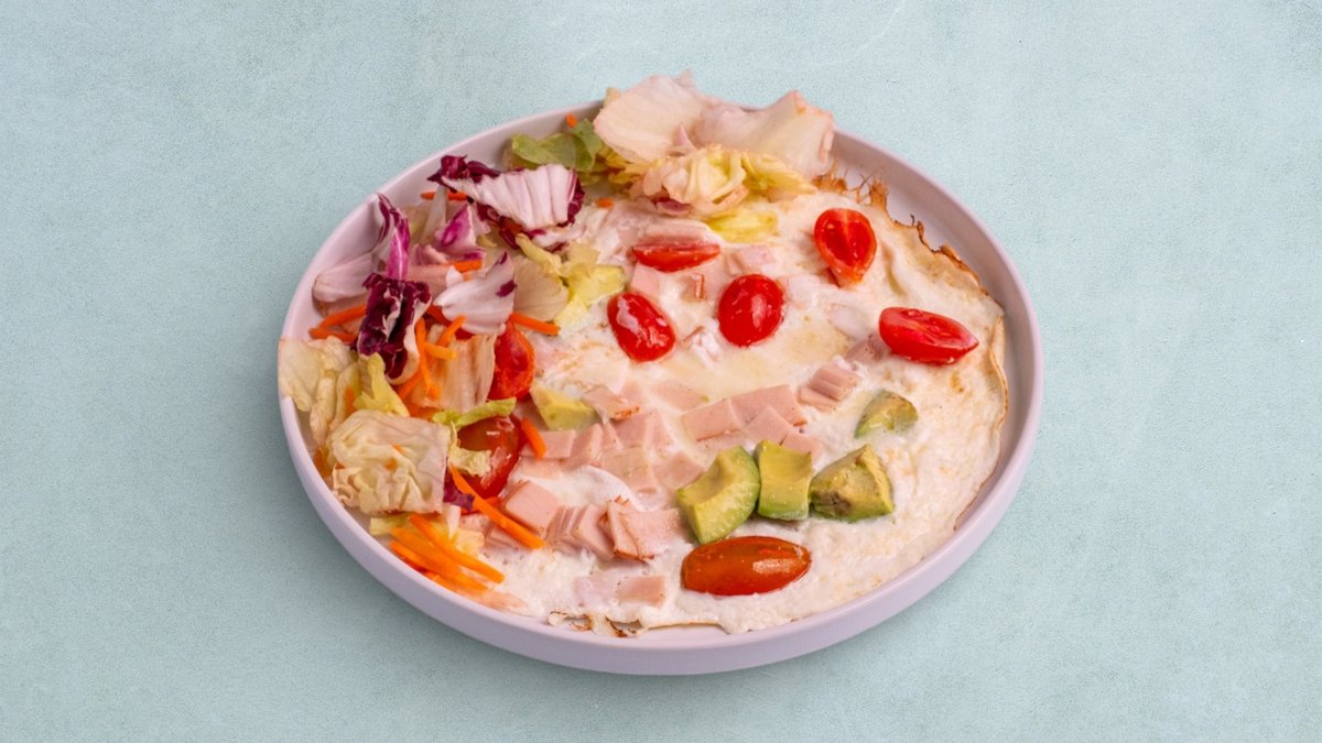 Ασπράδι αυγού με ντοματίνια, γαλοπούλα, αβοκάντο και βρώμη. Συνοδεύεται με πατάτες τηγανητές ή σαλάτα