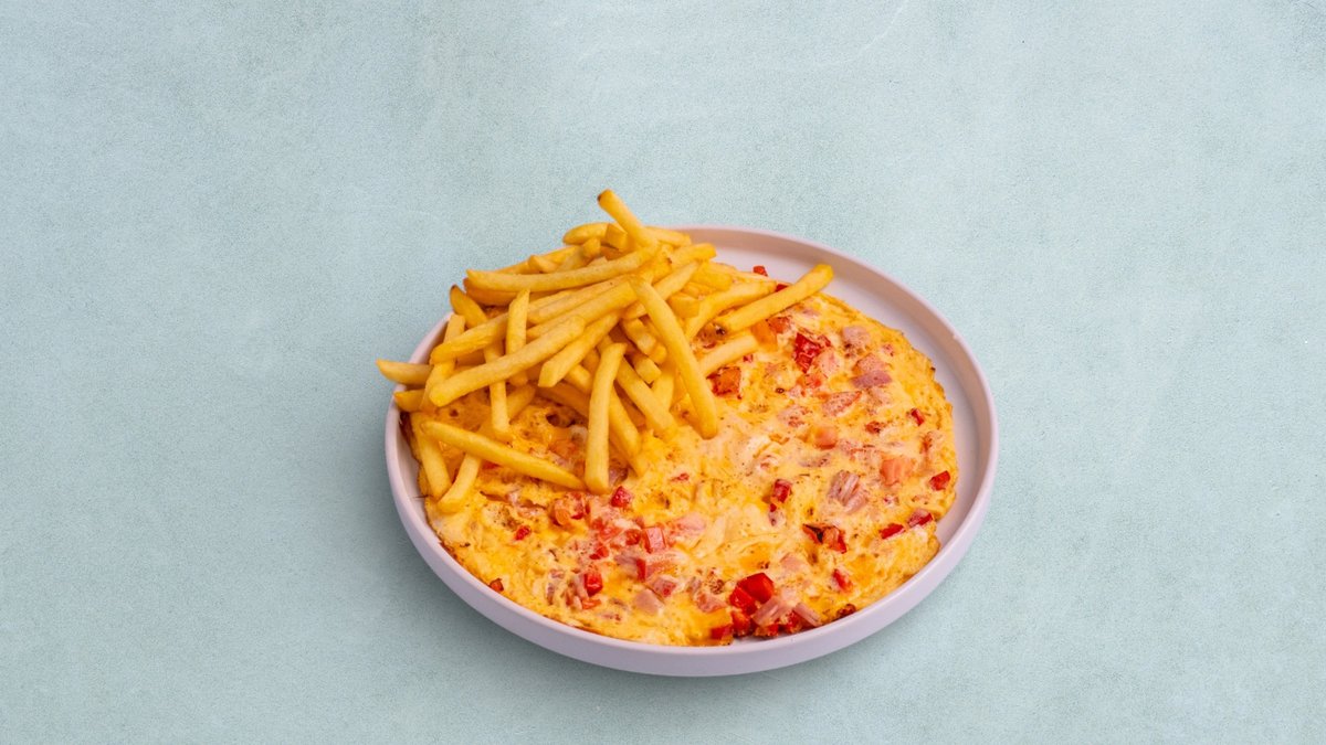 Με 4 αυγά, ντομάτα, πιπεριά, γαλοπούλα, μπέικον, cheddar και πατάτες