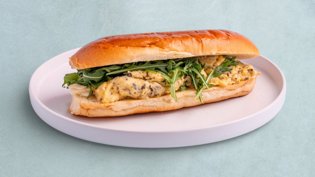 Ψωμί brioche με αυγά scrambled, ντομάτα και ρόκα