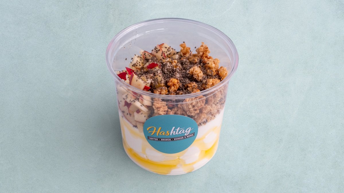 Με γιαούρτι 2%, μήλα φρέσκα, granola λευκή, καρύδια, chia και μέλι