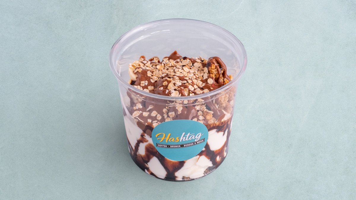 Με γιαούρτι 2%, granola σοκολάτας, σιρόπι σοκολάτας, nutella, μπανάνα και βρώμη