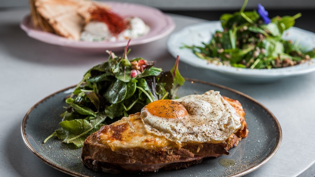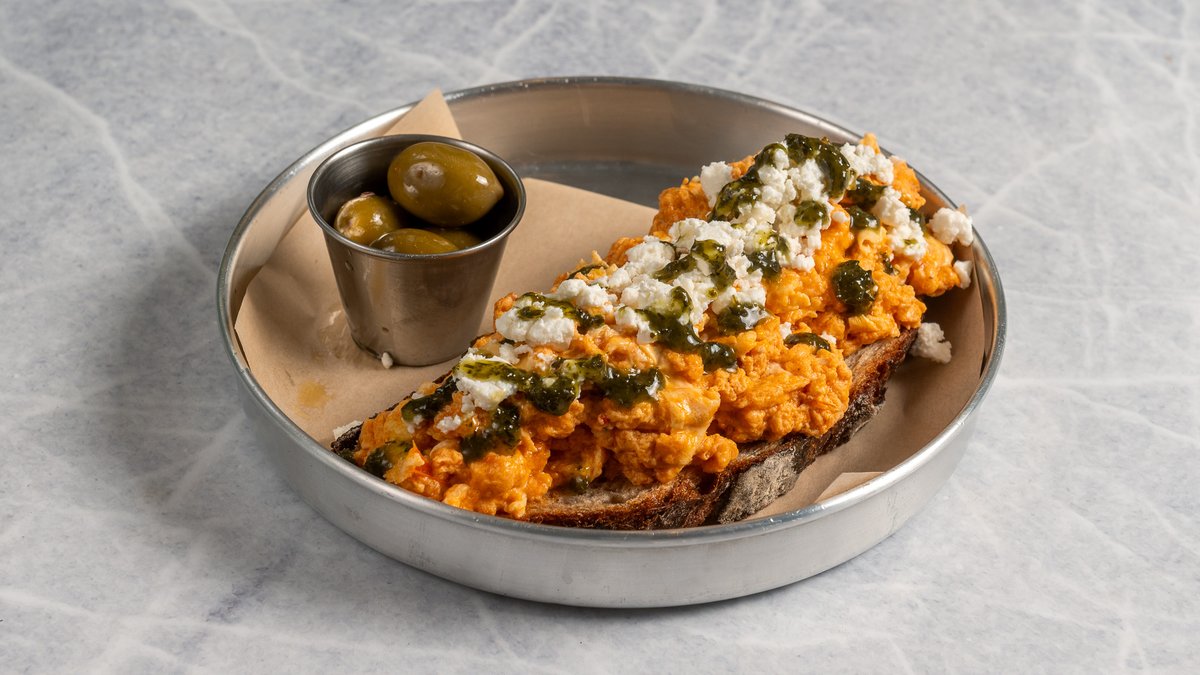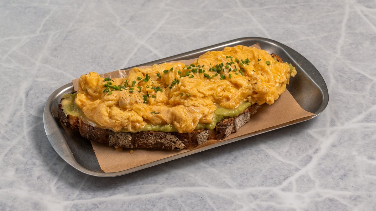 Αυγά scrabbled πάνω σε ζυμωτό ψωμί, με αβοκάντο, dressing lime και μέλι