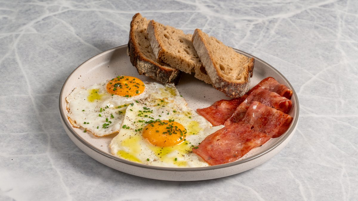 2 Τηγανητά αυγά και bacon σε προζυμένιο ψωμί