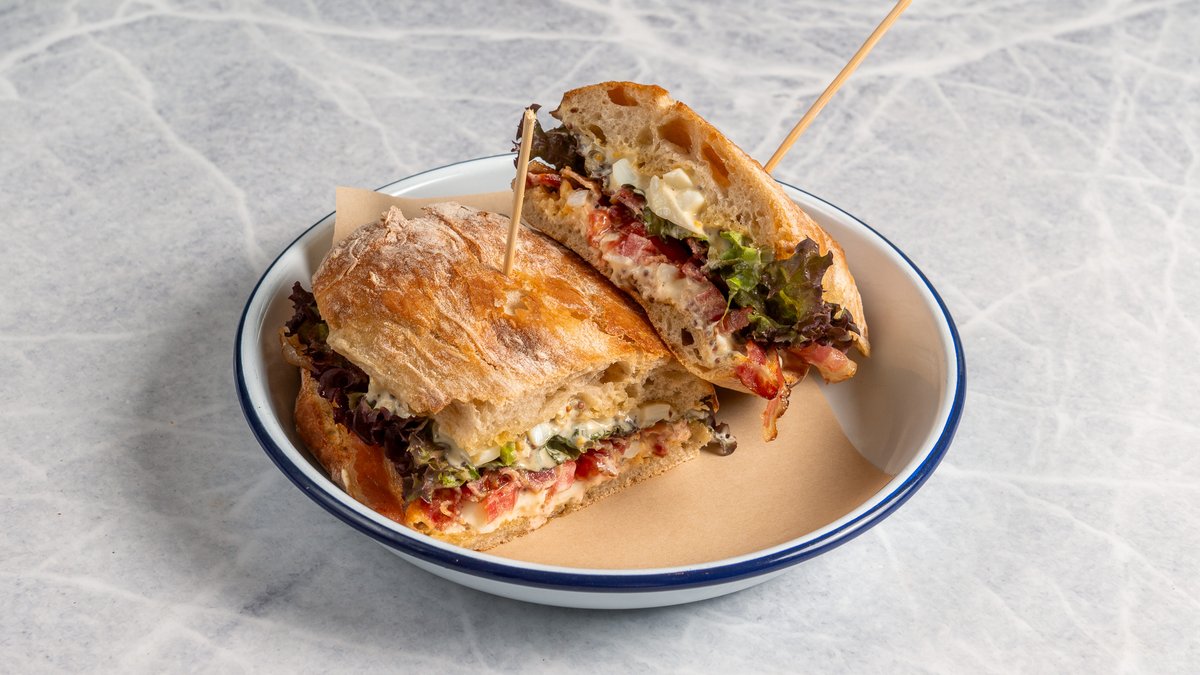 Ciabatta ψωμί, crispy bacon, λόλα, ντομάτα, αυγοσαλάτα και λάδι τρούφας