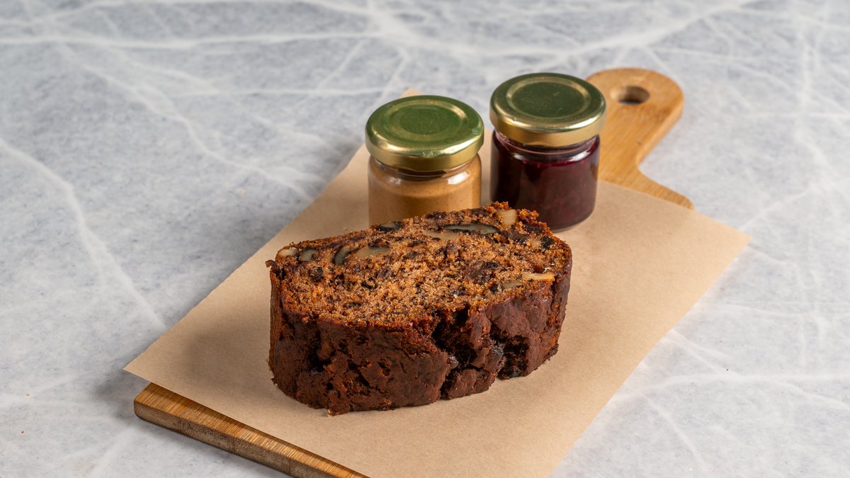 Banana bread, φυστικοβούτυρο και μαρμελάδα