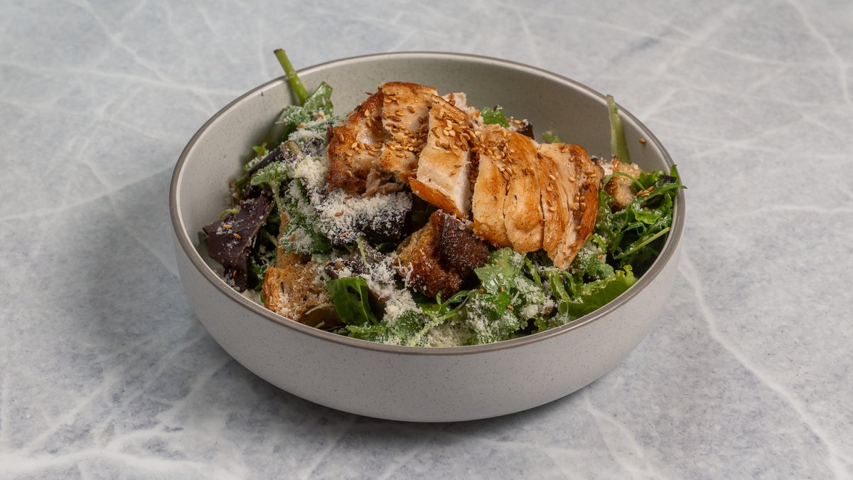 Σαλάτα με ψητό κοτόπουλο , παρμεζάνα , σταφίδες , κρουτόν & dressing μήλου