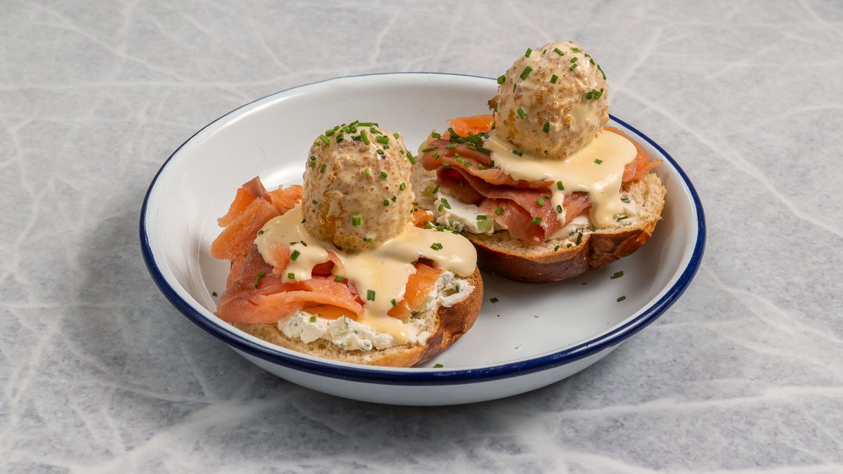 Flatbread, fried poached eggs, σολομός, hollandaise