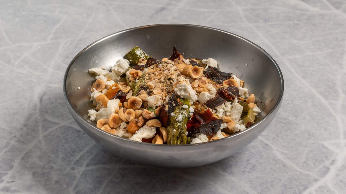 Με κολοκύθι, πιπεριά κίτρινη, πιπεριά κόκκινη, φουντούκι καβουρδισμένο, φέτα, μπέικον, δυόσμος και μουστάρδα σως