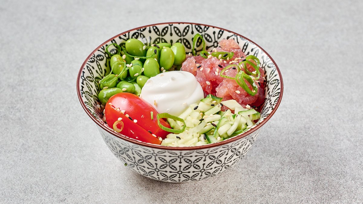 Με κινόα mix, ντοματίνια, αυγό, edamame και τόνο. Συνοδεύεται από miso lime dressing