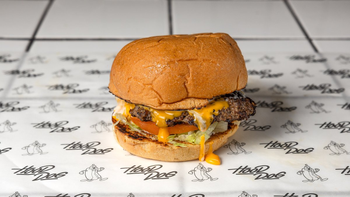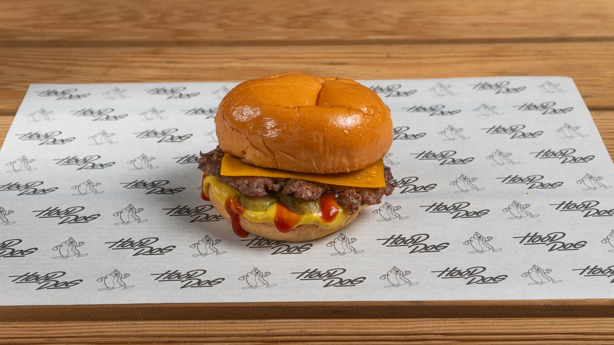 Μπιφτέκι μοσχαρίσιο, cheddar cheese, κέτσαπ, mustard και πίκλες